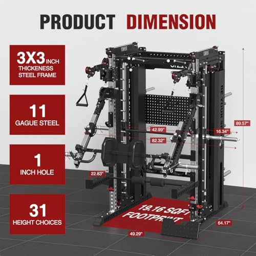 Professional Commercial Smithe Machine: The Smithe Machine with Cable Crossover and Leg Attachment is made of 3”x3” industrial steel and reinforced joints for 3600lb capacity. Overall dimensions are 49″L x 64″W x 89″H with multiple 1” holes. Heavy-duty base stabilizers prevent wobble during kipping pull-ups, while rubberized floor protectors safeguard hardwood surfaces—ideal for basement gyms or garage workout areas.