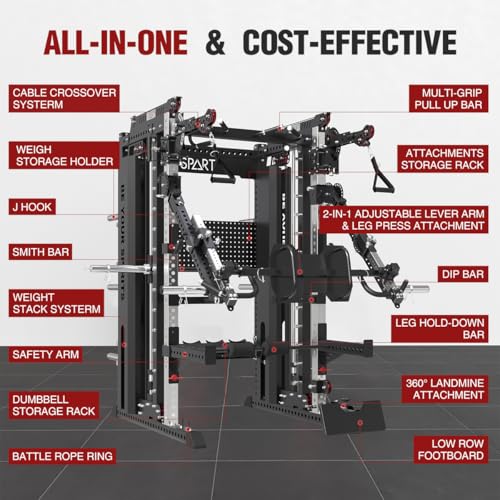 Specification: Commercial Smithe Machine with Weight Stack, All-in-One Power Cage Squat Rack Home Gym System with Leg Press Attachment & Cable Crossover, Multi-Functional Trainer with Dual Pulley System for Home Gym