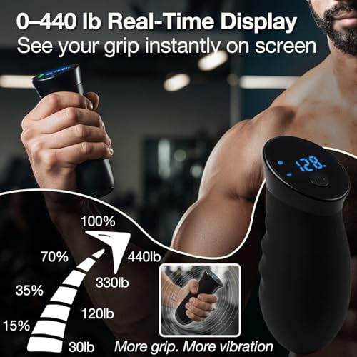 Specification: Digital Grip Strength Trainer, 0–440 lb Hand Gripper Strengthener with Real-Time Display (No Sound), 2 Modes: Test & Smart Vibration, Ergonomic Hand Grip & Forearm Strengthener, USB-C Rechargeable Hand Exerciser