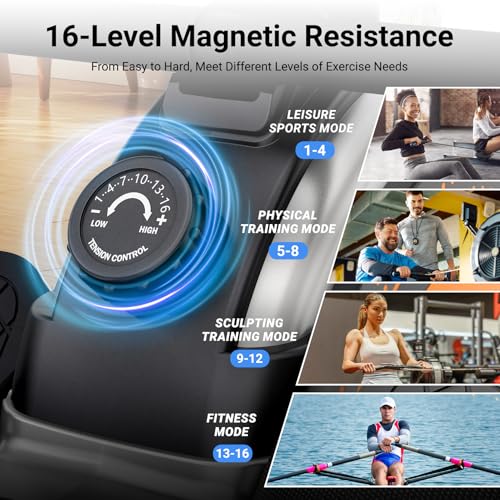 16-Level Magnetic Resistance: The rowing machine offers 16 levels of magnetic resistance that can accommodate all skill levels. Whether you are an experienced rower or a beginner, you can easily adjust the knob to tailor the difficulty and challenge yourself