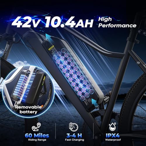 【REMOVABLE HIGH CAPACITY BATTERY】Electric bicycle goes the distance with a 42V 10.4Ah removable battery, supporting up to 60 miles on a single charge. Charging is easy—on or off the bike—and takes only 3–4 hours. Comes with a secure key lock system to keep the battery safe during parking or transport.