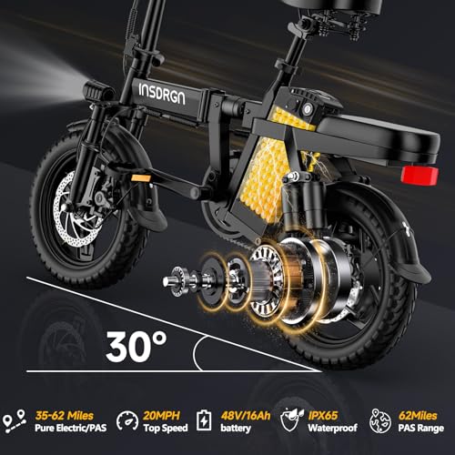 Folding Electric Bike for Adults Teens, Peak 1500W, 62 Miles PAS Range, 48V 16AH Removable Li Battery Ebike, 9 Shocks Full Suspension, 20 MPH Electric Bicycle, UL2849 Certified