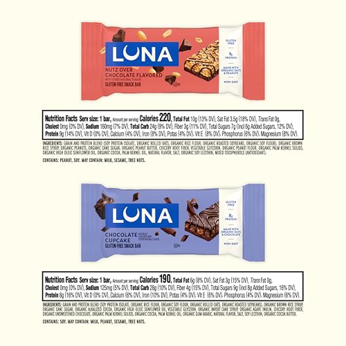 Bite into delight with LUNA Bar Gluten Free Snack Bars. Made with organic rolled oats plus a creamy coating, the snack bars in this variety pack contain 8-9 grams of plant based protein per bar. LUNA granola bars are delicious protein snacks to help you fight off hunger during your busy day, and with this two-flavor variety pack, you can enjoy both the Chocolate Cupcake flavor (8 grams of plant based protein per bar) and the Nutz Over Chocolate flavor (9 grams of plant based protein per bar). The individually wrapped snacks are conveniently portable and great for tossing in tote bags, purses, and backpacks when heading out the door, making them wonderful office snacks and on the go snacks. Non-GMO and certified kosher, these gluten free protein bars contain no high-fructose corn syrup. Experience the tasty bliss of LUNA – a burst of flavor to take on the day.