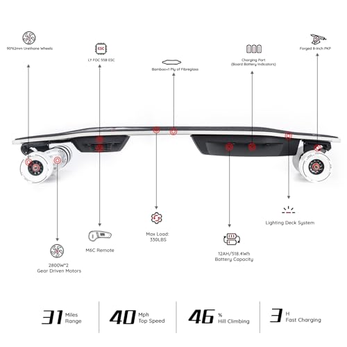 Specification: MEEPO Electric Longboard Skateboard with Remote for Adults, 34 MPH Top Speed, 30 Miles Long Range with 2800W*2 Gear Drive Motor, Bamboo & Fiberglass Deck, 330 LBS Max Load, Voyager X