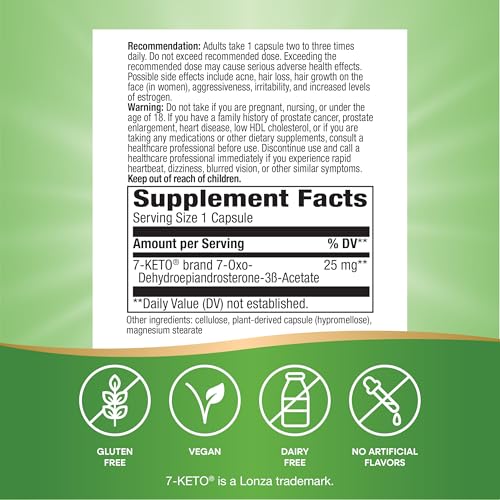 Specification: Nature’s Way 7-KETO, DHEA Metabolite, Supports Energy Metabolism*, 25 mg Potency Per Serving, Gluten Free, Vegan, 60 Capsules (Packaging May Vary)