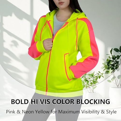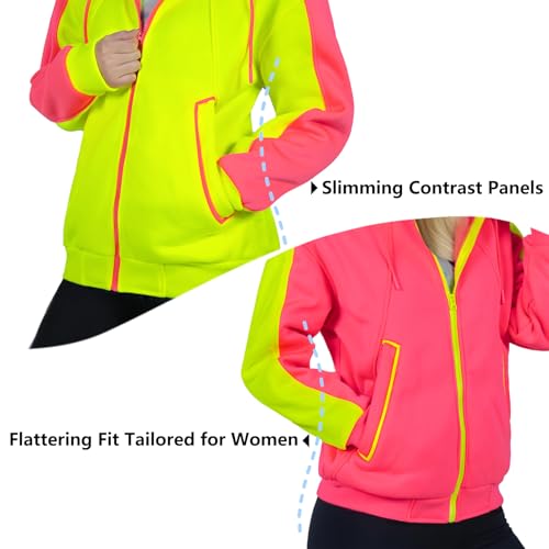Neon Hoodie Sweatshirt for Women High Visibility Fleece Jacket with Full Zipper for Outdoor Athletic Safety