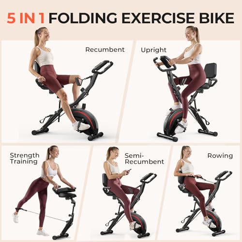 5 IN 1 DESIGN: Foldable exercise bike combines multiple exercise modes in one, supporting high intensity fat burning, low intensity stretching and strength training. Equipped with resistance bands for rowing and stretching. You can easily realize all-round workout goals at home.