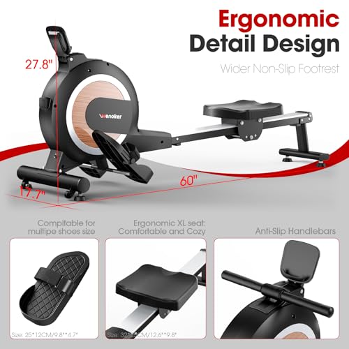 [Whisper-Comfort Home Workout] WENOKER Rower features a silent system: dual-ring magnetic control, silky nylon pulley, and silent belt, ensuring a noiseless rowing experience. Whether it’s late at night or early morning, it won’t disturb anyone. Its ergonomic seat and rubber rollers ensure cushioned support, making this rower machine ideal for long, joint-friendly sessions.