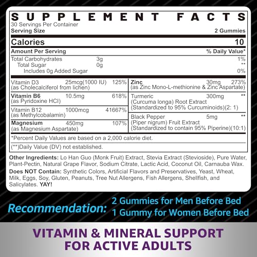 Specification: Zinc and Magnesium Supplement, Zinc Magnesium Aspartate Post Workout Gummies for Men Women, with Vitamin B6, B12, D3, Turmeric for Nighttime Recovery, Reduce Fatigue, Boost Immunity & Sleep, 120 Count