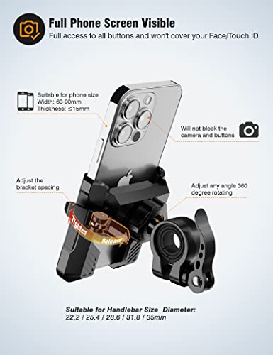 【EASY INSTALLATION】It only takes 1 second to install or remove the phone! Hold the arms and push them inward to expose the knob on the other end, and turn the knob to adjust the width of the motorcycle phone mount to fit the size of the phone. (Important note: Make sure there is enough room for your phone. Otherwise, excessive clamping force will damage the phone).